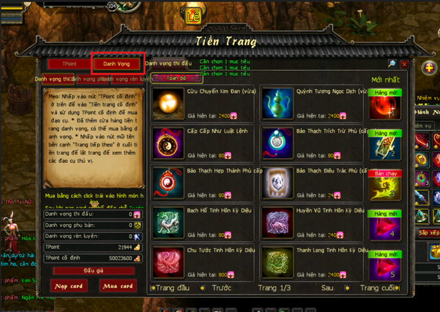 - Vật phẩm mua từ Danh Vọng Tiền Trang là cố định.