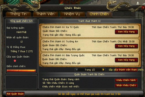 - Phần này sẽ hiển thị thông tin về vị trí thành trì – Tên quân đoàn đối chiến – Trạng thái – Thời gian chiến tranh