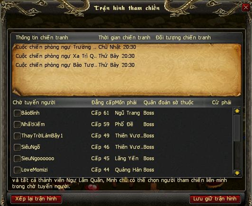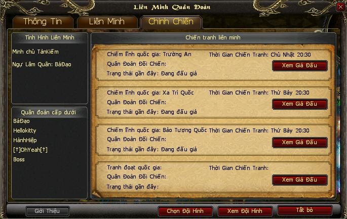 - Chọn Đội Hình (dành riêng cho Quân Đoàn Trưởng): Tại đây Quân Đoàn Trưởng sẽ quyết gửi quân tiếp trợ đến tham gia các Trận chiến Tranh Đoạt Quốc Gia