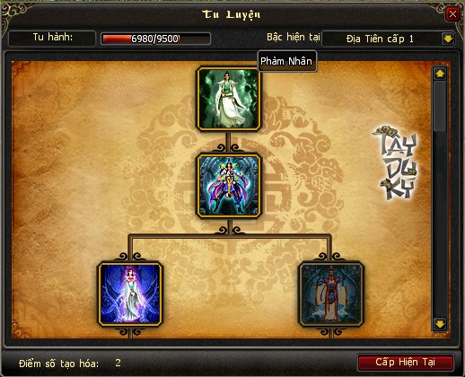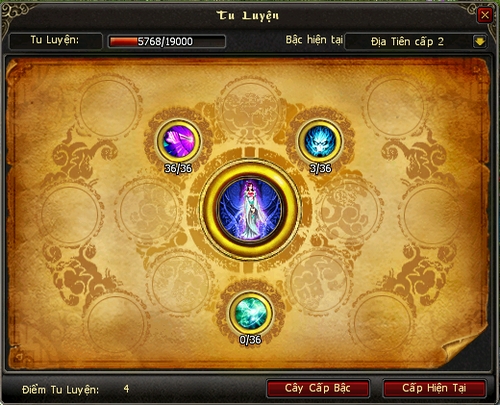 Ví dụ: Tại cảnh giới Địa Tiên cấp 1, Thượng Tiên có thể chọn nâng cấp 1 trong 3 kĩ năng tu luyện: Chân Võ (gia tăng công kích nội ngoại công); Vô Vong (tăng sát thương chí mạng); Vô Ngã (tăng đẳng cấp chí mạng).